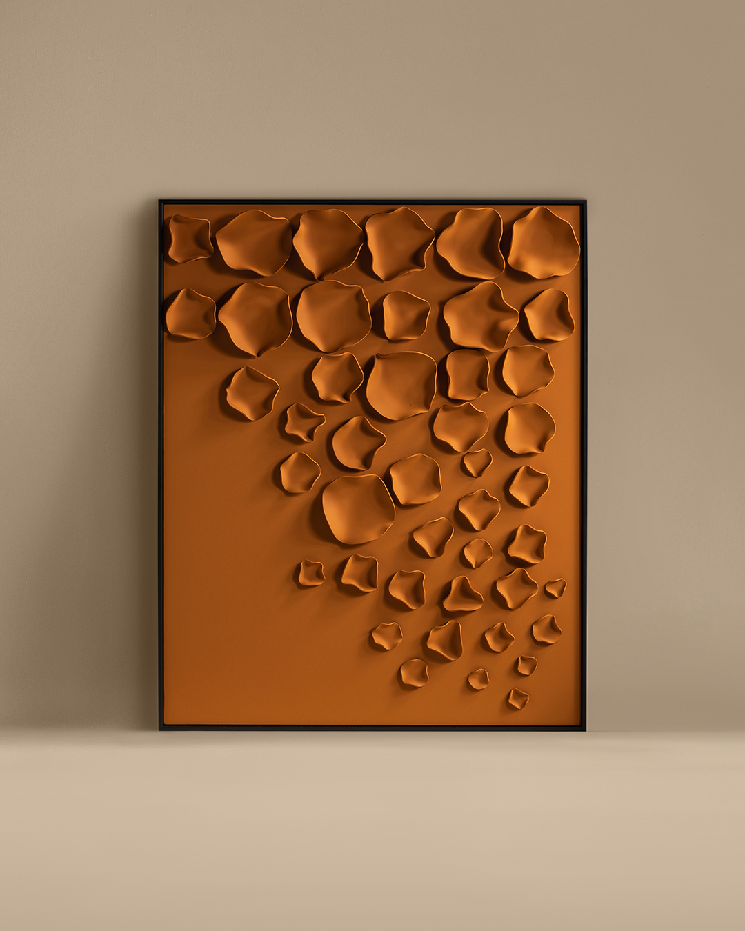 Rendering a romantic French allure to spaces, Perianthe flirts boldly through its burnt orange hue thereby offering a cluster of artistic petals. Floral folds disperse and skew towards the bottom of the piece, varying in sizes and adding a subtle drama to the art.