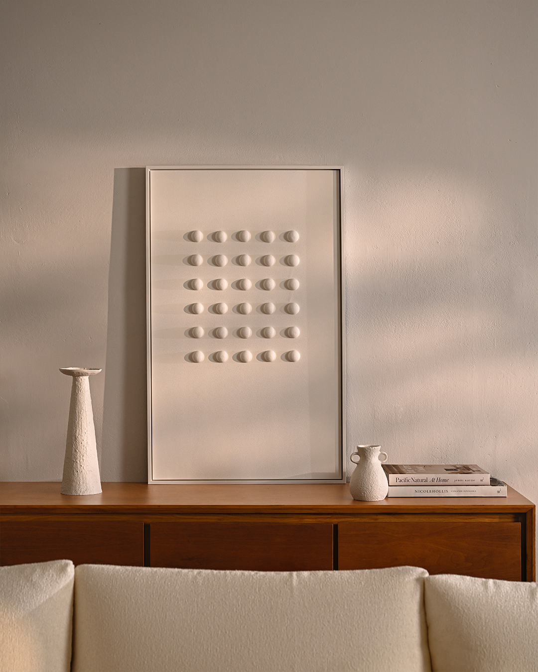 Each piece is carefully handcrafted using boards, forms, textures, and color mixtures, revealing a unique work of artistry. As with all handmade work, gentle irregularities may appear—subtle cracks and variations as part of its natural character. The artwork comes framed and ready to hang.