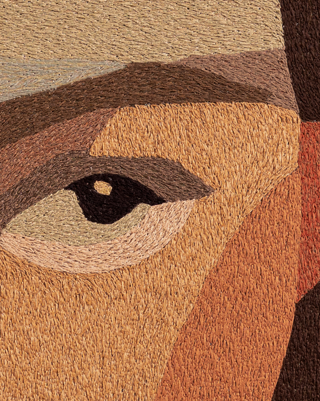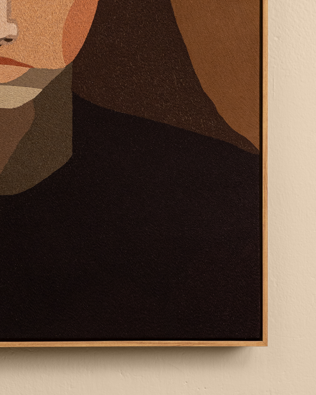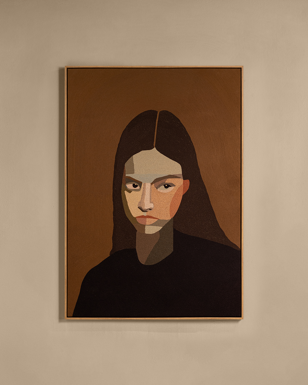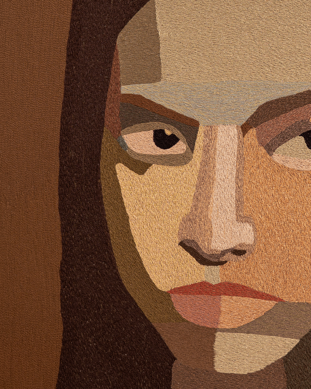 In the hush between heartbeats, where silence hums and shadows breathe, Saurelle bathes in the tender ache of her own stillness. Her gaze holds the quiet pause between knowing and longing, between presence and retreat. Melancholy, like a soft veil, drapes across her face not as sorrow’s burden, but as beauty’s echo; an emotion too intricate to name. Finely hand embroidered through planes of muted tone and fractured light, the art piece is a meditation on the quiet dignity of solitude.